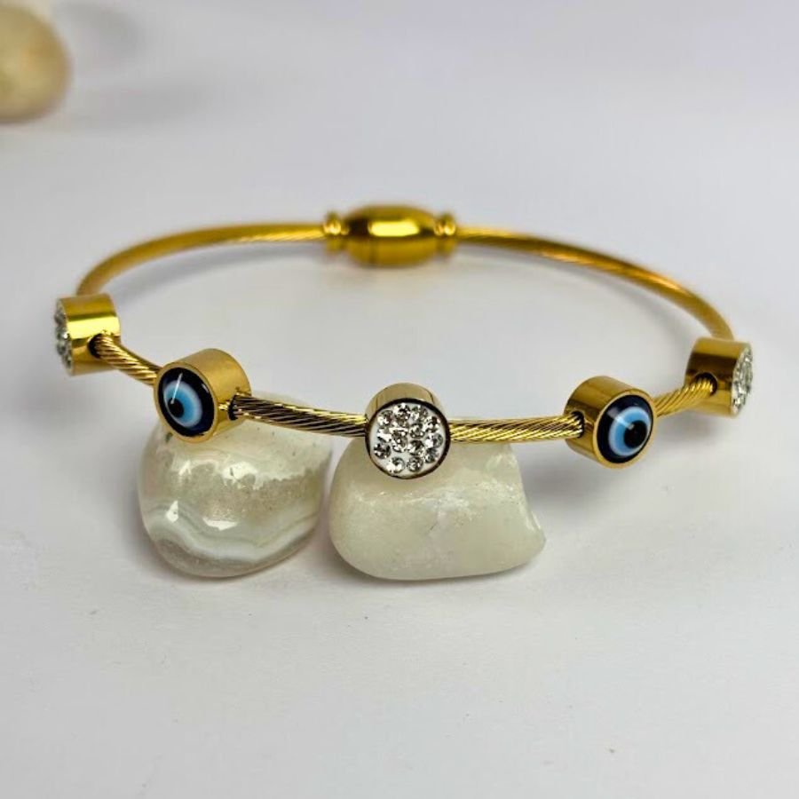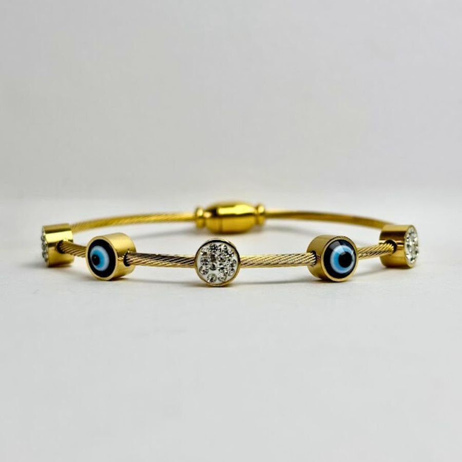 This gold cable bangle is adorned with sparkling crystal charms and iconic evil eye motifs, blending modern minimalism with a hint of tradition. Lightweight yet striking, it’s designed to keep you protected in style. Wear it solo for a subtle statement or stack it with your everyday bracelets for a bold layered look.