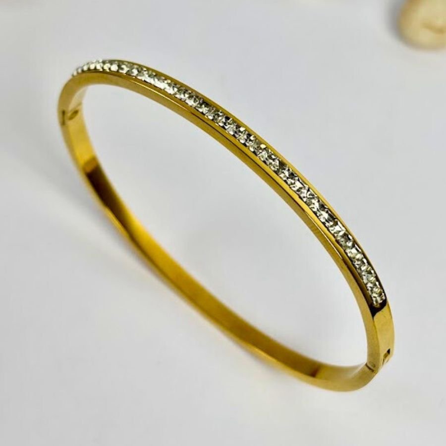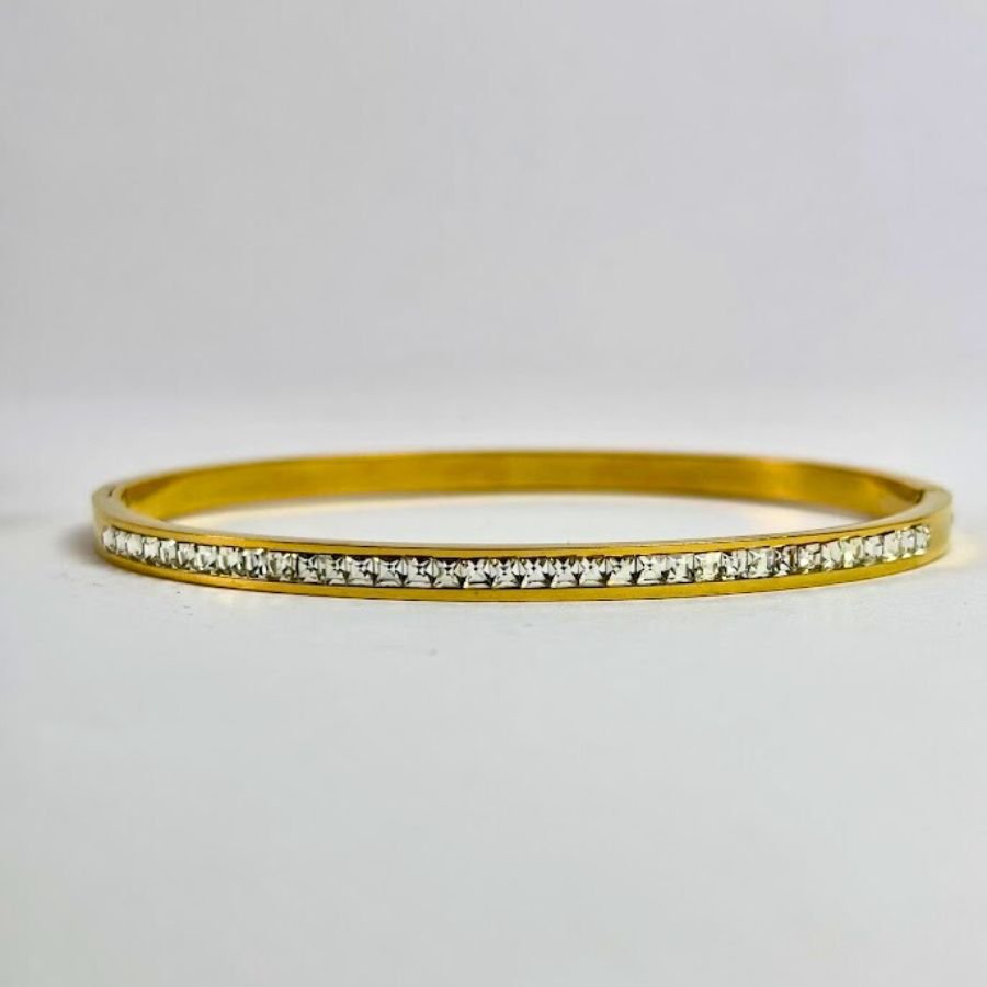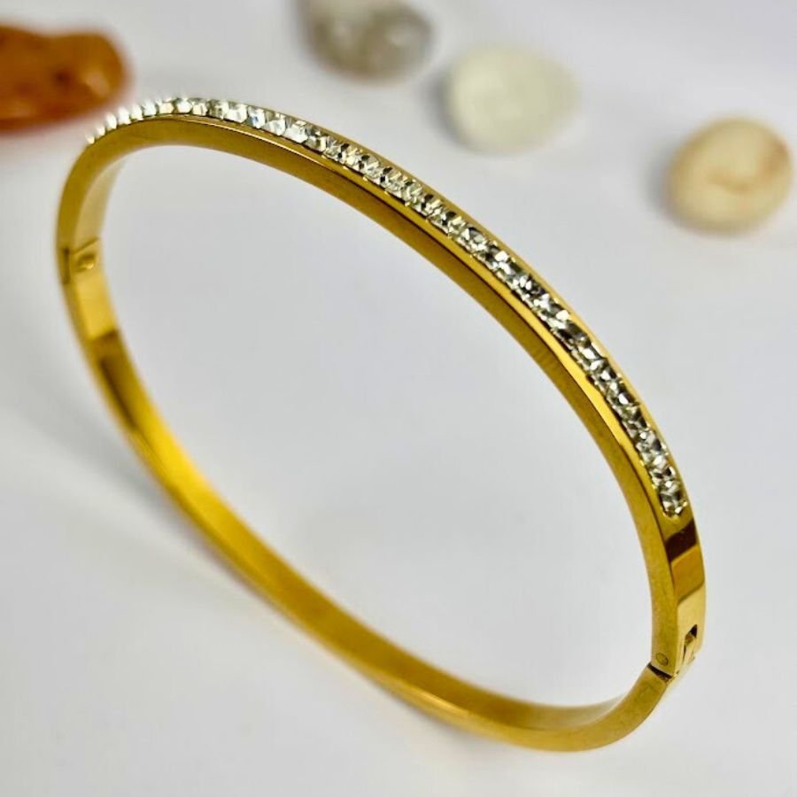 A timeless bangle designed to add a subtle sparkle to your style. Crafted with a sleek gold-plated finish and lined with delicate crystal stones, this piece blends sophistication with minimal charm. Perfect for daily wear or special occasions, it complements both traditional and modern looks effortlessly.