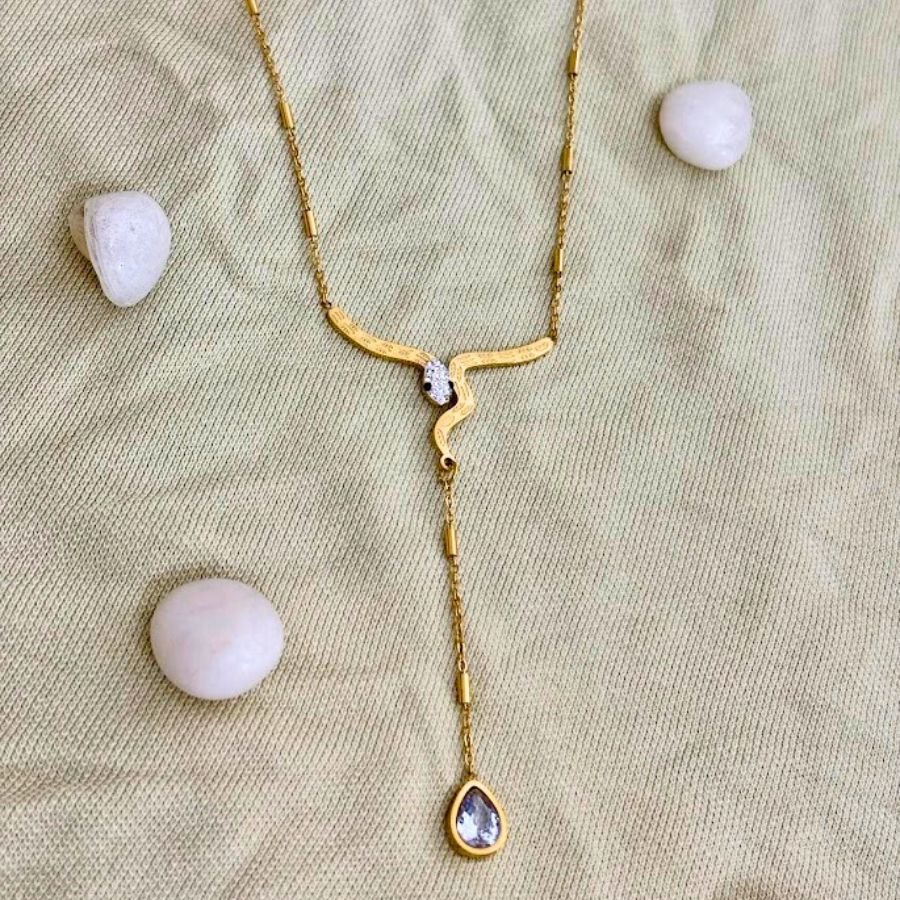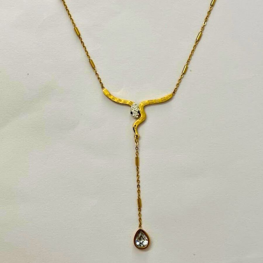 A captivating necklace featuring a snake-inspired design with a sparkling diamond-like stone at the center. The intricate golden chain gracefully twists and ends in a dangling teardrop, adding a unique and edgy vibe to any outfit.