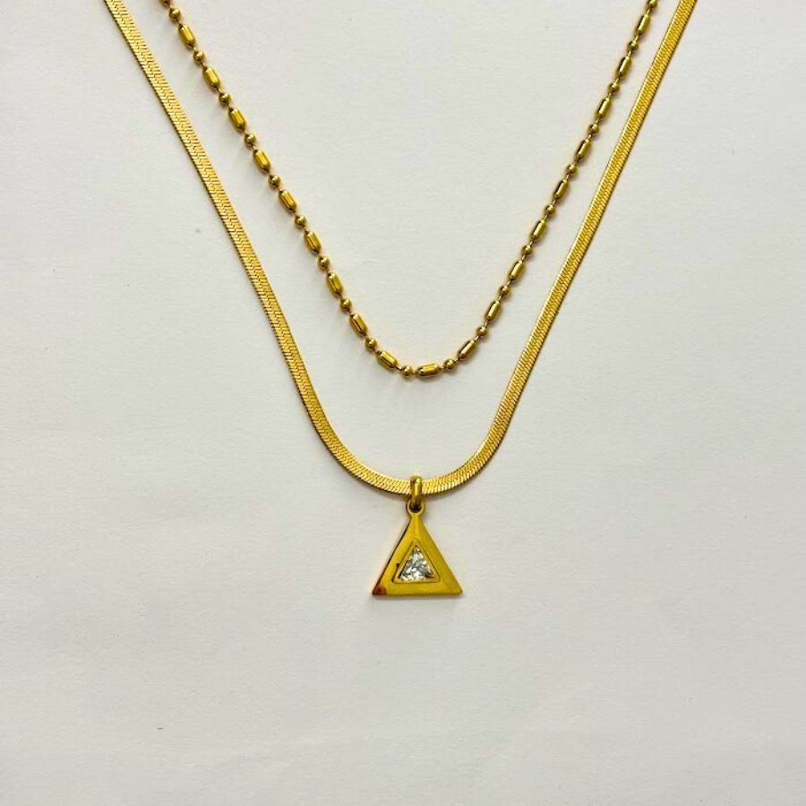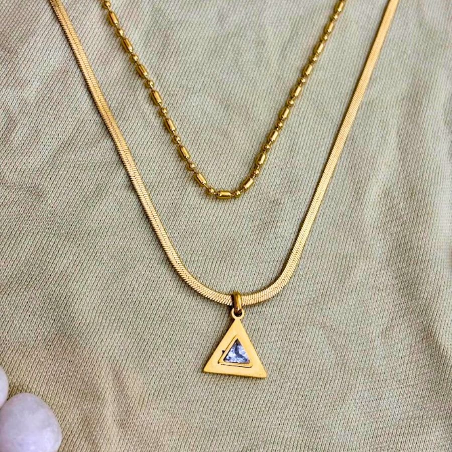 A chic and geometric gold necklace featuring a sleek triangular pendant with a small, sparkling diamond-like stone in the center. Its dainty design sparkles effortlessly, making every moment feel a little more special and playful. The layered chain adds an extra dimension to this stylish and modern accessory.